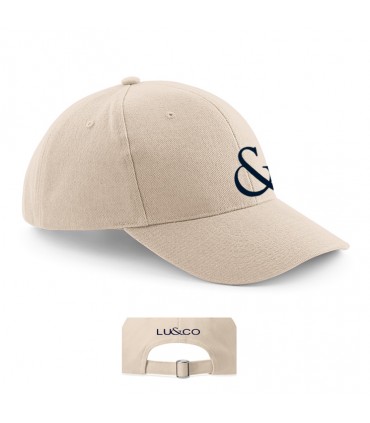 Gorra Beige de 6 paneles 100 % Algodón Drill grueso peinado, con con hebilla tri-glide metálica para ajuste y logos impresos en color a elegir, en las zonas delantera y trasera en vinilo aterciopelado.