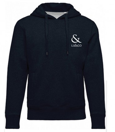 Sudadera hombre de algodón orgánico con capucha, dos bolsillos con ribetes en la parte delantera.