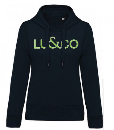 Sudadera de algodón orgánico con capucha. Felpa perchada. Dos bolsillos con ribetes en la parte delantera. Capucha
