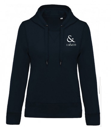 Sudadera de algodón orgánico con capucha. Felpa perchada. Dos bolsillos con ribetes en la parte delantera. Capucha